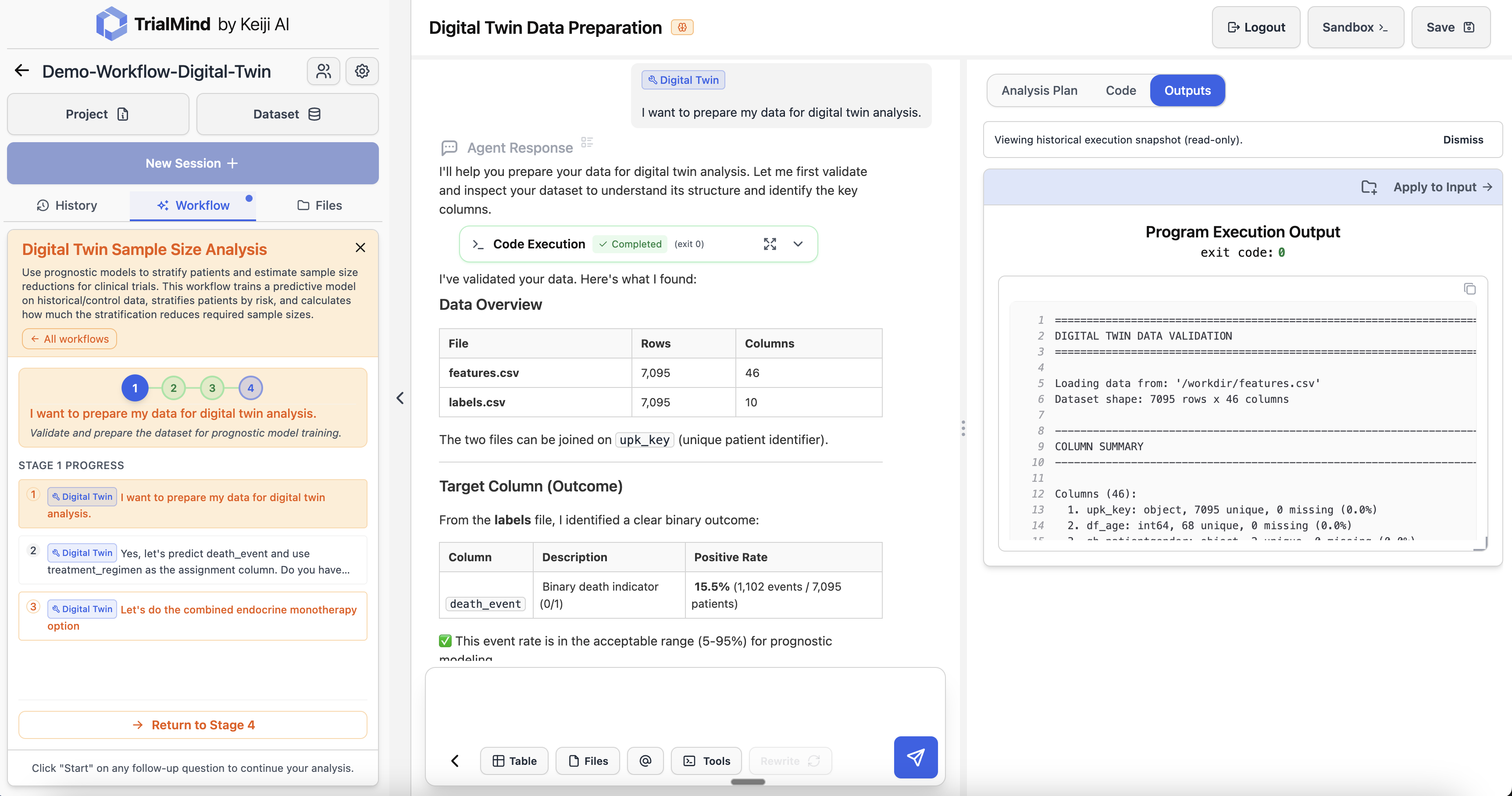 Upload and validate your dataset for digital twin analysis. AI automatically inspects the data structure, identifies key columns, validates the target outcome (e.g., death_event), and confirms the event rate is suitable for prognostic modeling.