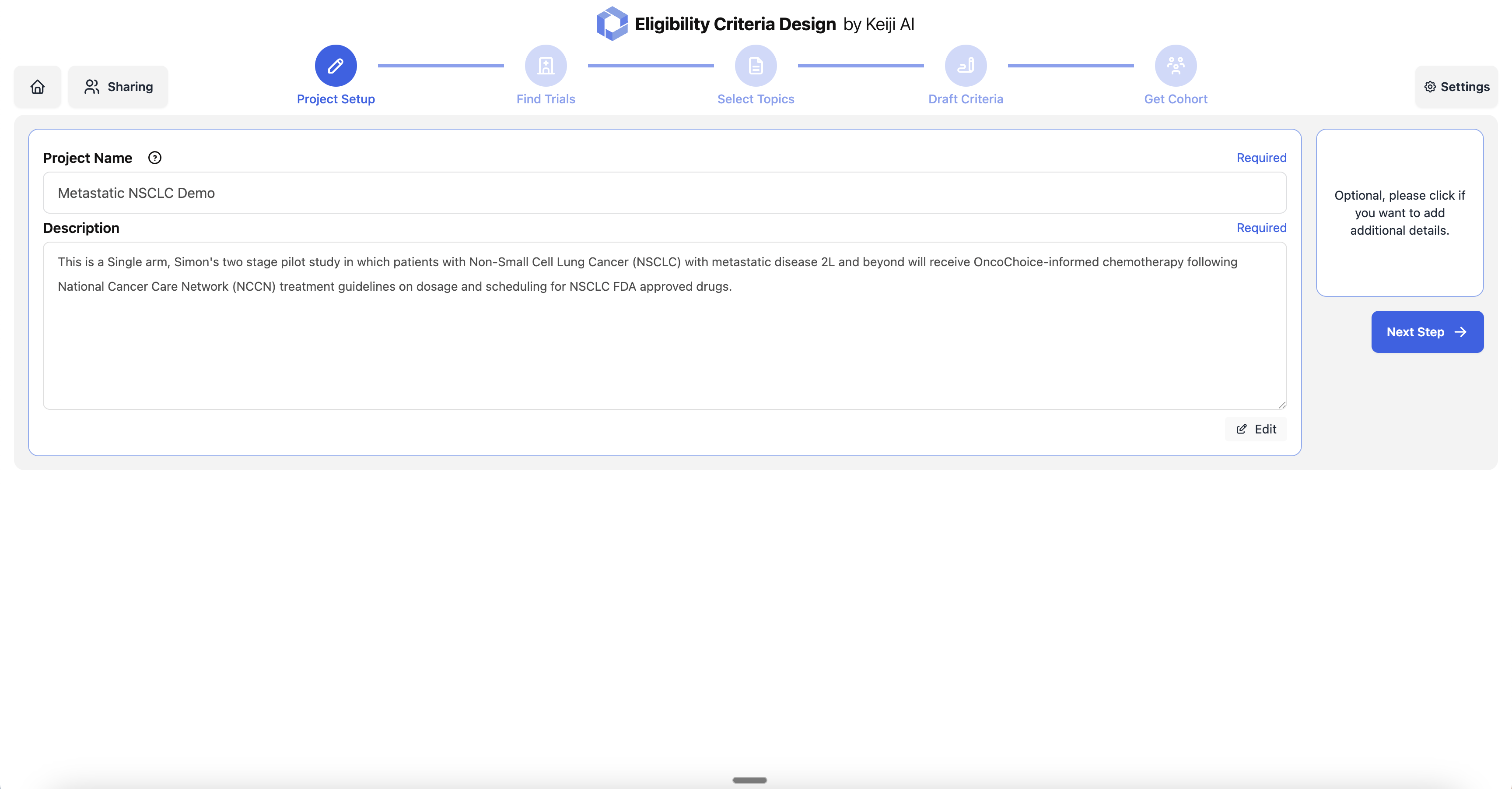 Start by defining your clinical trial project with a name and detailed description. Specify the study design, target population, and therapeutic approach to guide the eligibility criteria generation process.