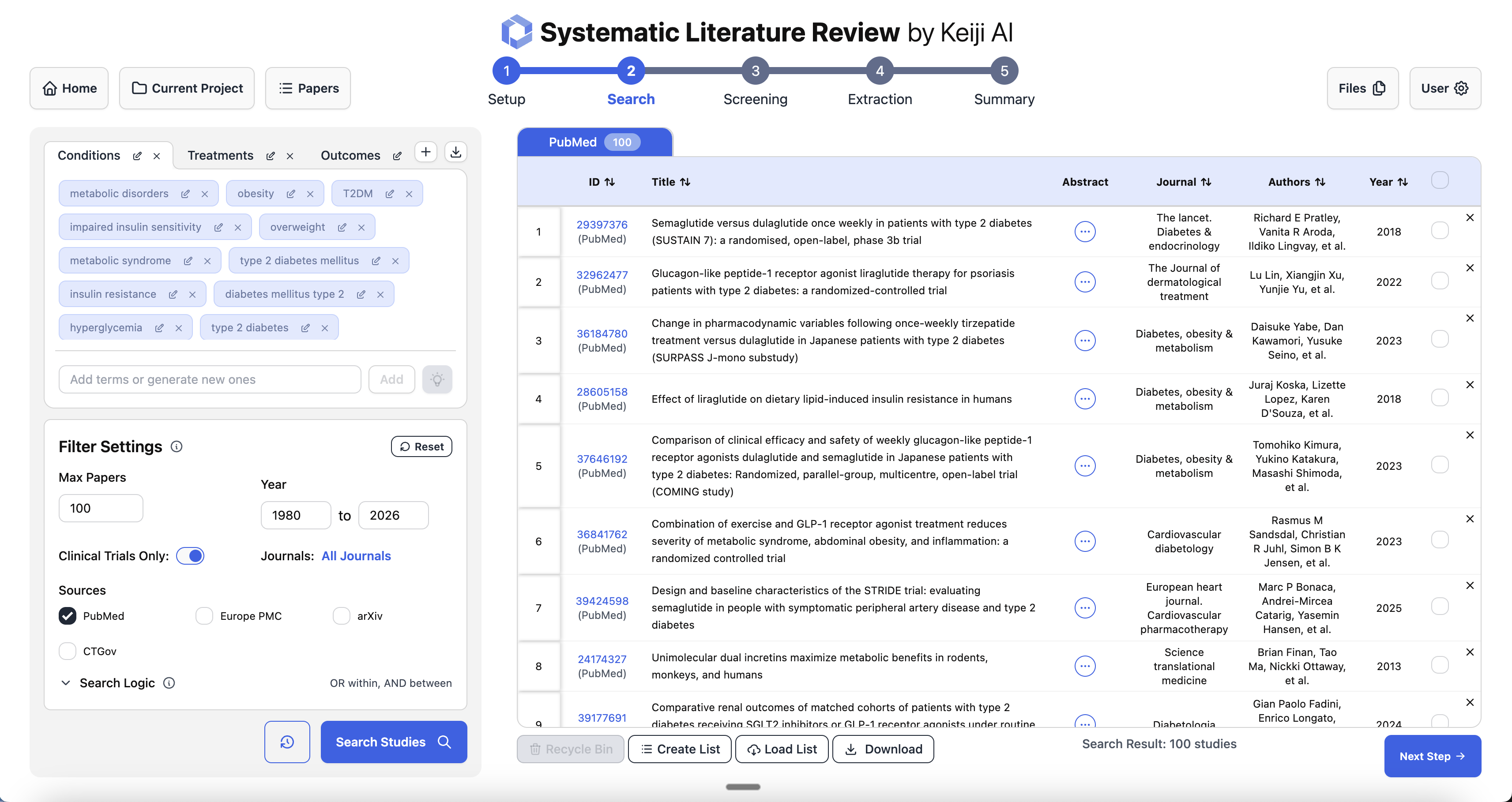 Define conditions, treatments, and outcomes to search across PubMed, Europe PMC, arXiv, and CTGov