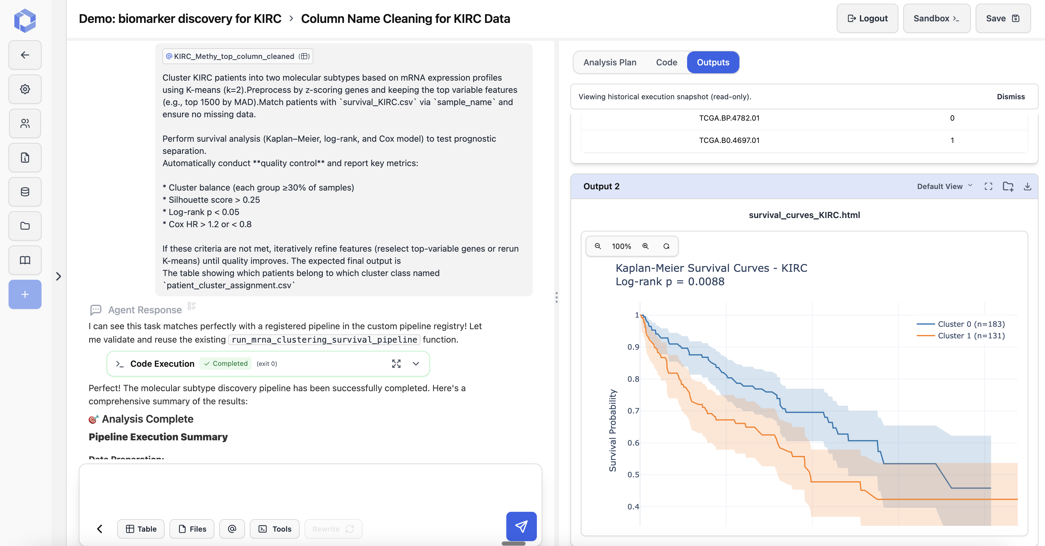 Cluster patients into molecular subtypes using K-means clustering on mRNA expression profiles. Perform survival analysis with Kaplan-Meier curves and log-rank tests to identify prognostically significant subtypes.
